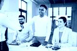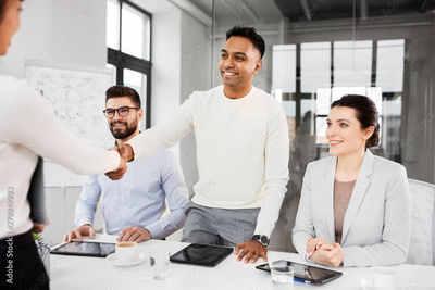 job, hiring and employment concept - international team of recruiters having interview with female employee and shaking hands at office