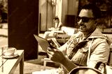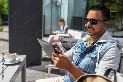 travel, tourism and lifestyle concept - indian man with tablet computer and coffee at city street cafe