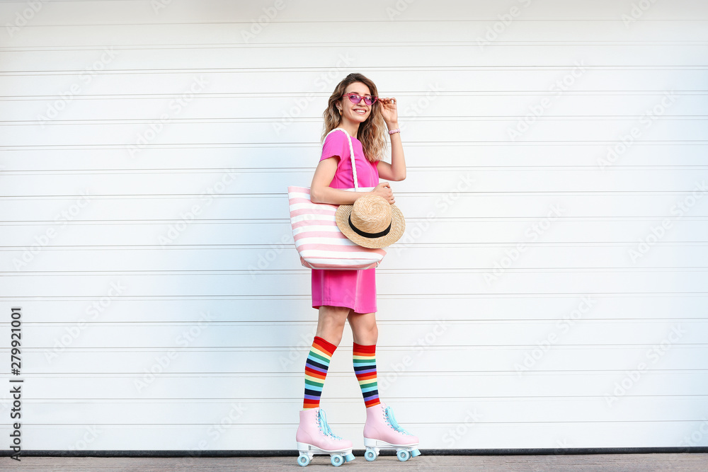 Happy young woman with retro roller skates near white garage door