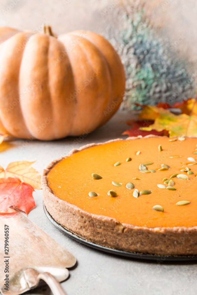 Homemade sweet Pumpkin Pie with Autumn Decoration