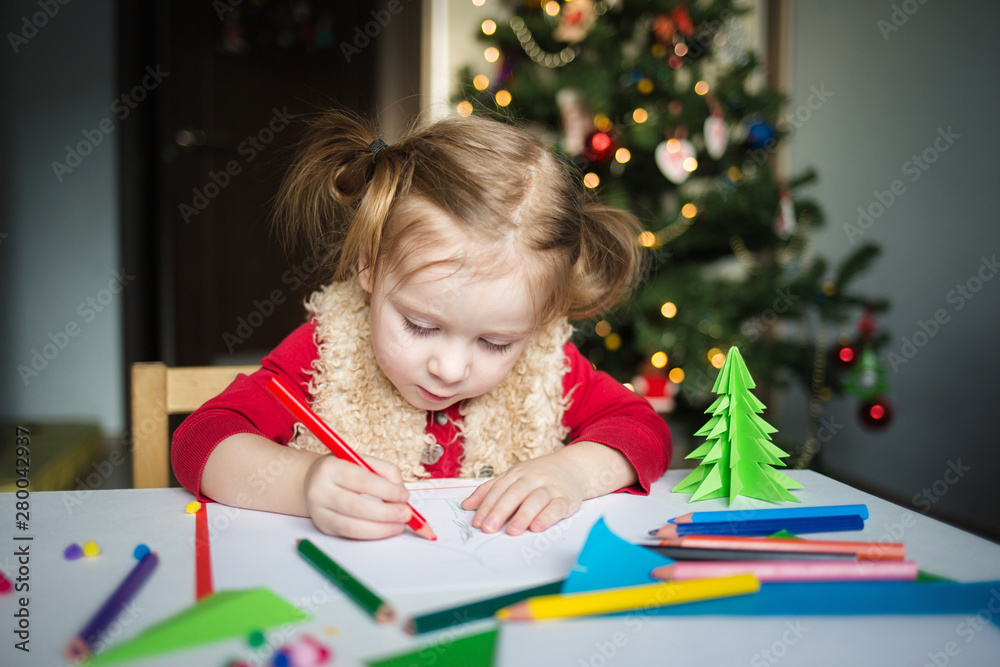 the child writes a letter to Santa Claus. a little girl draws with crayons on the background of the Christmas tree. the concept of new year kids creativity