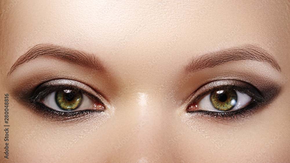 Closeup female eyes with bright make-up, great shapes brows, extreme long eyelashes. Celebrate makeup, luxury eyeshadows