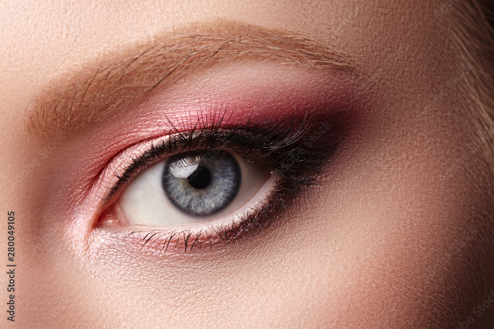Closeup Macro of Woman Face with Eyes Make-up. Fashion Celebrate Makeup, Glowy Clean Skin. Summer Pink Eyeshadows