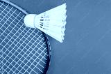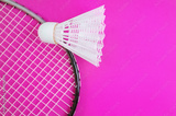 A shuttlecock and badminton racket on a bright pink background. Copy space. Amateur accessories for playing badminton. Flat lay, minimalism, top view.