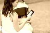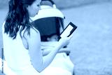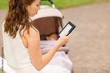 motherhood, leisure and technology concept - close up of mother with child in stroller reading internet book at summer park