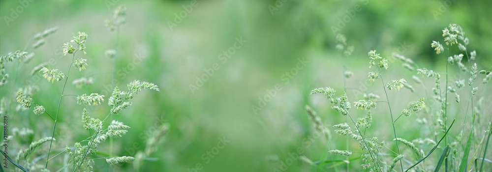 Beautiful gentle green field meadow grass, nature summer landscape, close up. pastoral rural artistic image. summer season. Abstract Meadow Grass Background. banner Wide format, copy space. soft focus