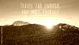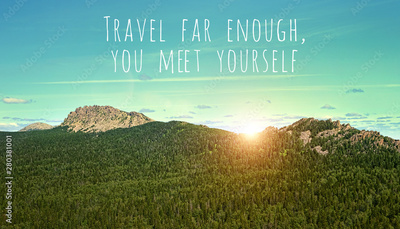 Travel far enough, you meet yourself - inspiration quote on natural mountain landscape. picturesque view of mountain, theme for travel backdrop design card.