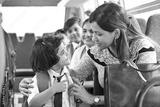 Happy teacher taking care of schoolgirl while traveling in school bus