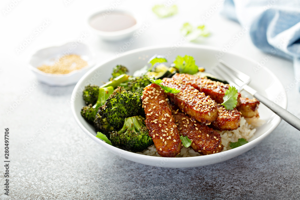 Teryaki tempeh with rice and roasted vegetables