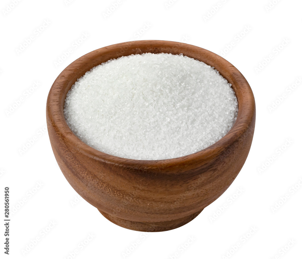 Sugar in wooden bowl isolated on white background