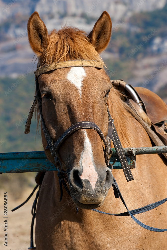 Horses at a hitching post