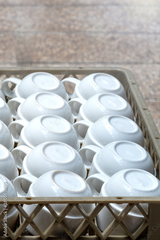many of the same white mugs for drinks, coffee or tea. stand upside down in a drawer