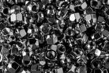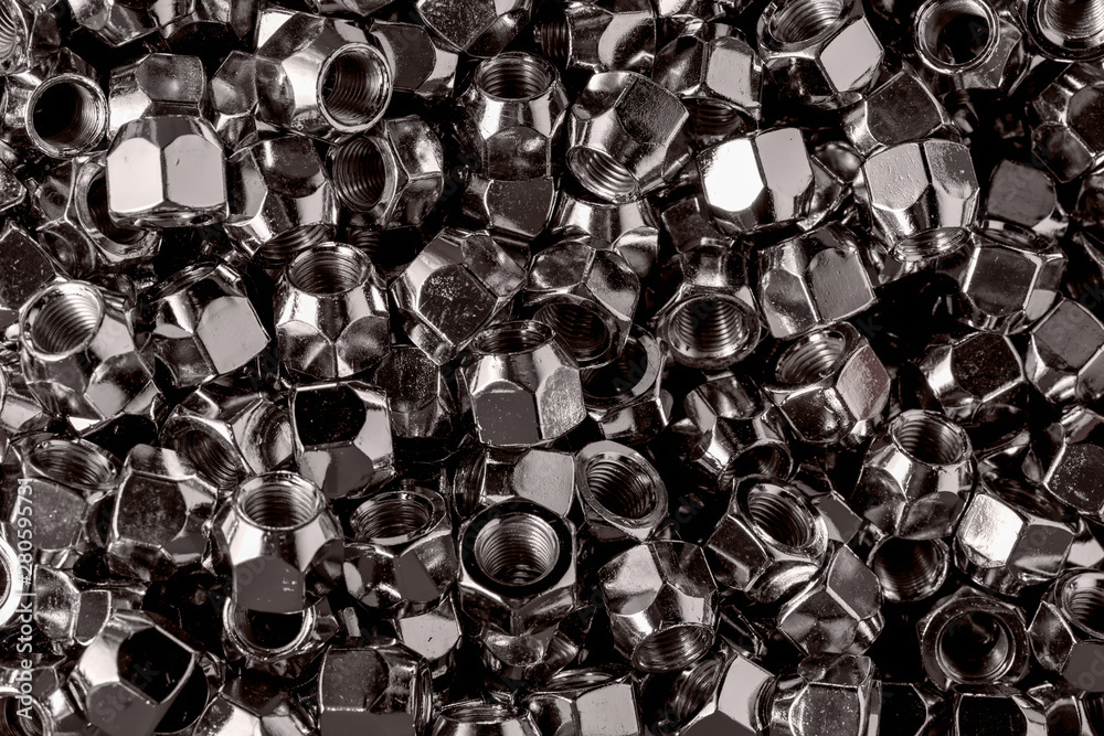 Chromed screw nuts from above. Many screw nuts. Screw nuts of different sizes. background.