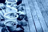 Set of seasonal fall autumn creamy soups on a table
