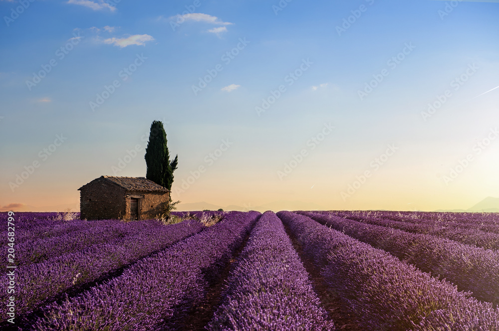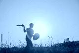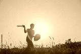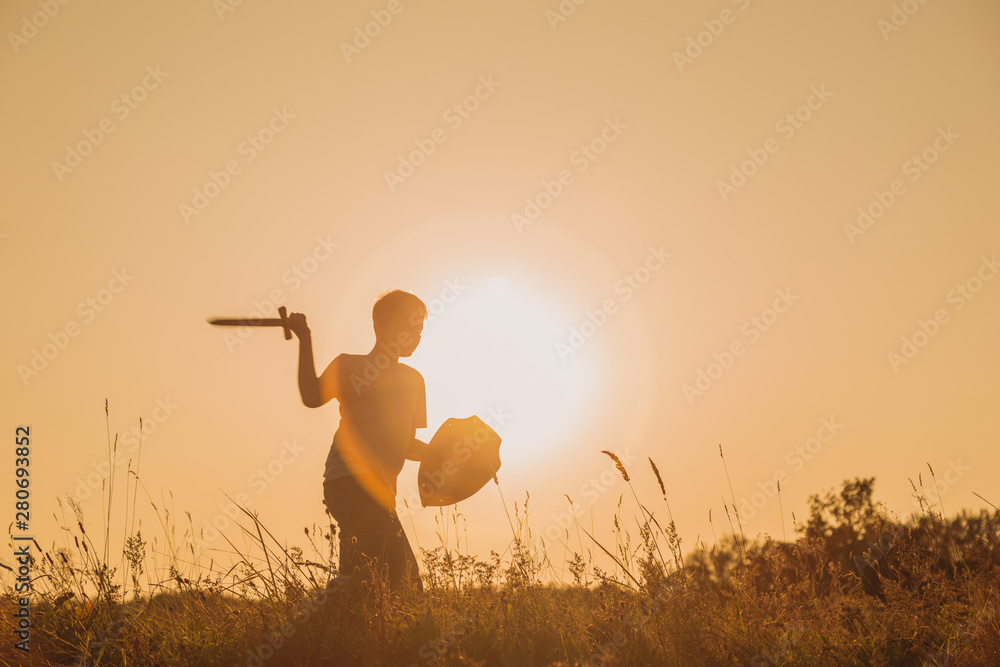 Black silhouette of cute young caucasian kid isolated on sunny orange sunset or sunrise sky background playing sword with invisible enemy. Horizontal color photography.