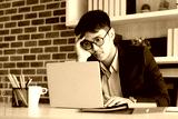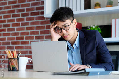 Young asian businessman concentrate on working with laptop computer at office, Asian office man comtemplate on working with laptop computer business people and office lifestyle concept