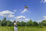 Cute white kid playing colorful kite outdoor at countyrside landscape. Color photo of boy isolated at sunny blue sky background.