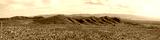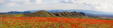 Poppy field against a background of mountains and a cloudy sky. Panorama. Horizontally.