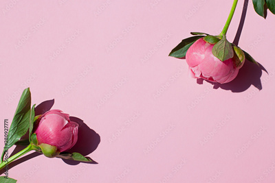 Beautiful pink peony flower blooming frame on the pink background. Top view