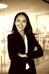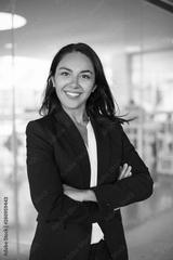 Confident cheerful young businesswoman. Professional business woman standing with crossed arms and smiling at camera inside office building. Business concept
