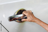 Elderly woman open the car door