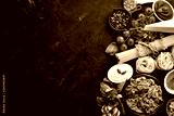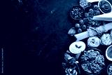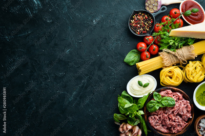 Ingredients for pasta Bolognese. On a black background. Top view. Free space for your text.