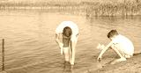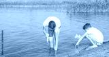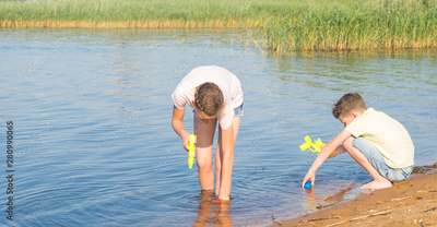 a girl and a boy take water from a lake into water guns in order to play them, against the backdrop of the landscape