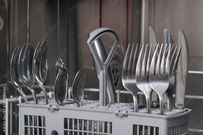 close-up of a container with cutlery, fork, spoon and knife, after washing in the dishwasher