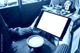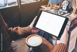 Mockup image of hands holding black tablet pc with blank white screen with coffee cup on wooden table