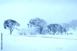 Winter landscape with picnic tables and snow covered eucalyptus trees