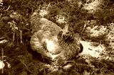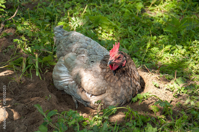 Chicken sat on summertime grass.