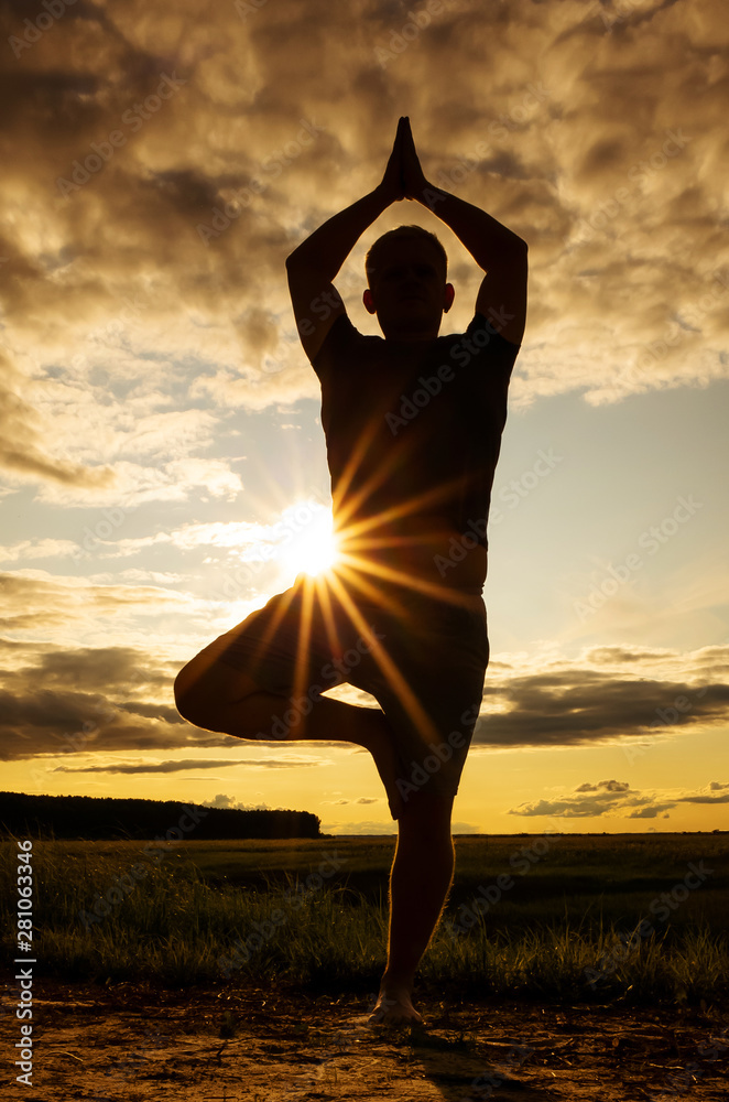 A man in a t-shirt and shorts is practicing yoga in the fresh air. Silhouette against the setting sun and sky. Concept of amateur yoga, healthy lifestyle, meditation practice. Place for text.