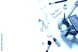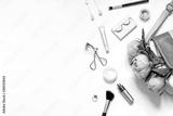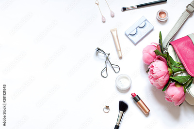 Beauty lifestyle concept frame on the white background with fashion accessories and cosmetics. Top view. Copy space