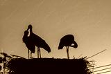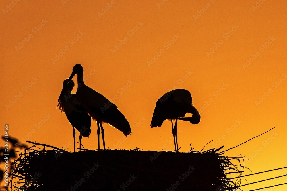 Gniazdo z bocianami na tle pomarańczowego nieba