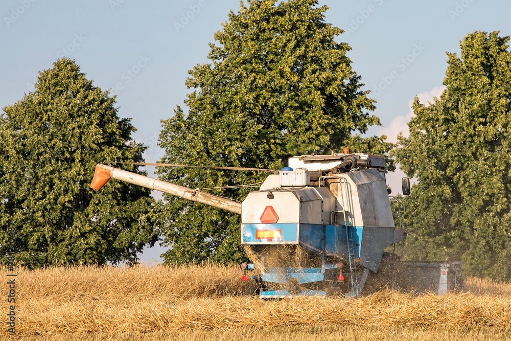 Kombajn pracujący na polu i zbierający żyto, zboże
