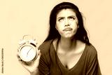 Beautiful young woman hold alarm clock and gets lazy, boring, when she has to wake up early for work on Monday morning. Pretty girl doesn’t want to work because she is lazy lady. She make frown face
