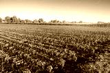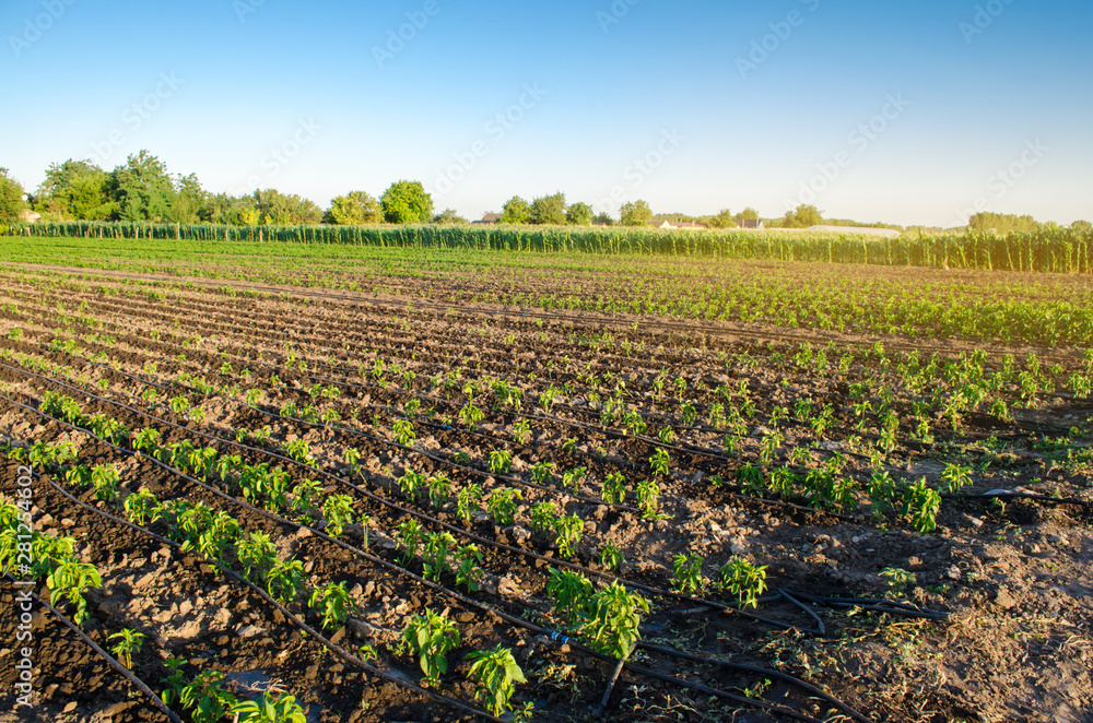 Rows of young pepper on a farm on a sunny day. Growing organic vegetables and drip irrigation. Eco-friendly products. Agriculture and farming. Ukraine, Kherson region. Selective focus