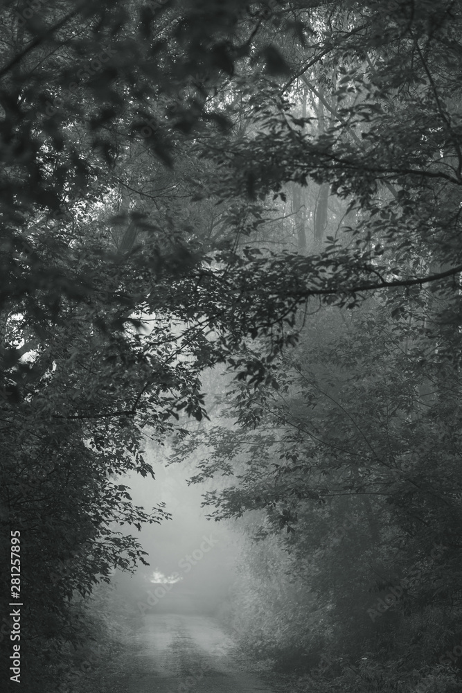 Beautiful black and white photography of early morning foggy countryside landscape.