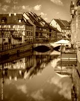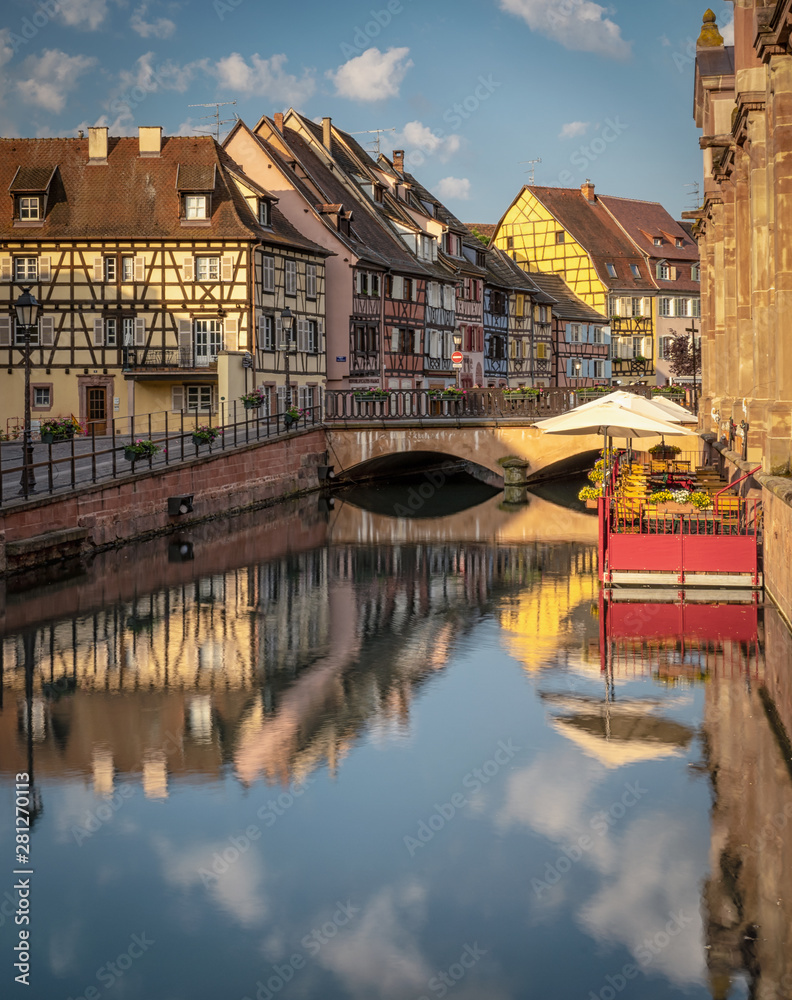 Flanked by colourful half-timbered fishermen's houses, the Quai de la Poissonnerie runs alongside the Lauch River. Colmar, Alsace, France in the Petite Venise area.