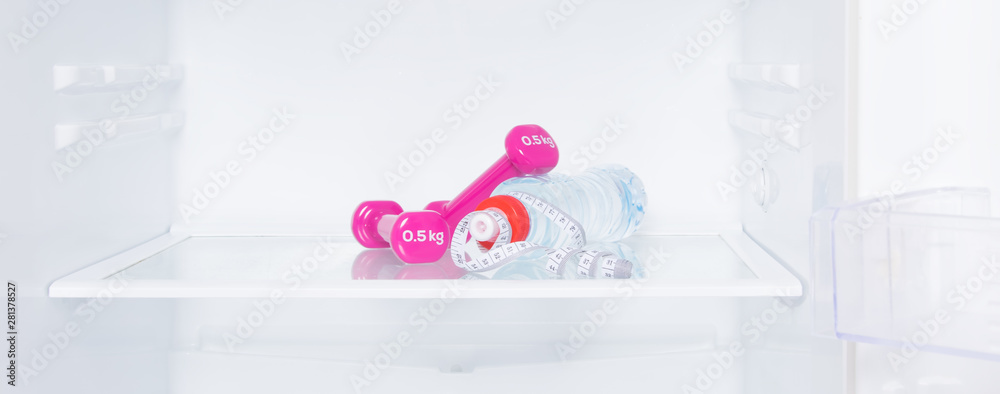in a white fridge on a shelf, a sports diet, water with a tape for measuring volumes and pink dumbbells