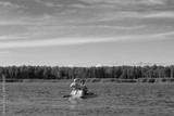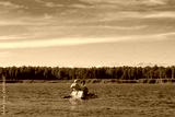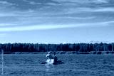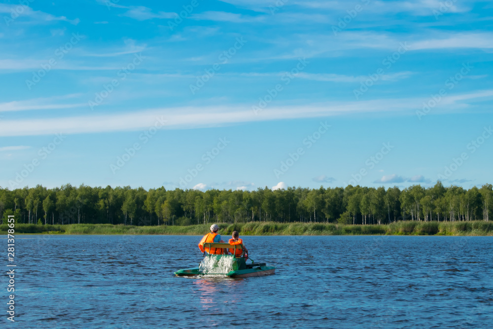 mother and son in life jackets, riding a catamaran in the open water, beautiful landscape