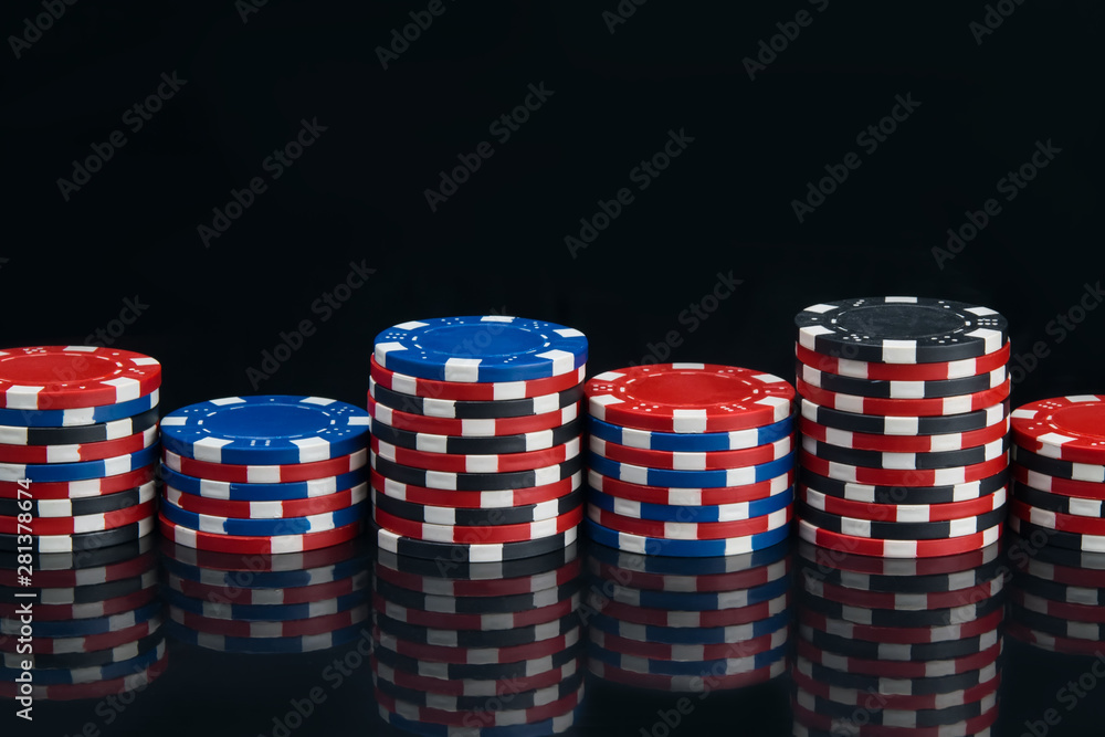 on a black background, with reflection, pyramids of chips, for playing poker, lined up, close-up