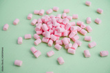 handful of pink mini marshmallows on a green background