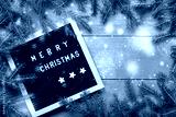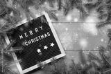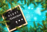 Christmas background. Christmas fir tree branches with snow on blue rustic wooden board near letter board with words Merry Christmas.