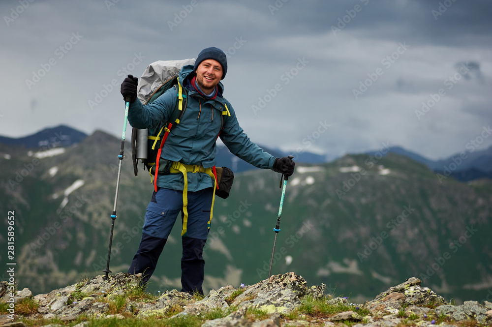 Smiling hiker man stands on the cliff against green mountain range. Man has a backpack and trekking poles. Mountain trekking. Copy space