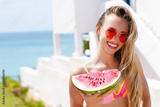 Close Up Of Happy Girl in pink sunglasses and watermelon fruit. Summer holidays and fun time weekend. Summertime concept. Smiling young woman in fashion swimsuit. Selective focus. Beach Summer outfit.