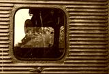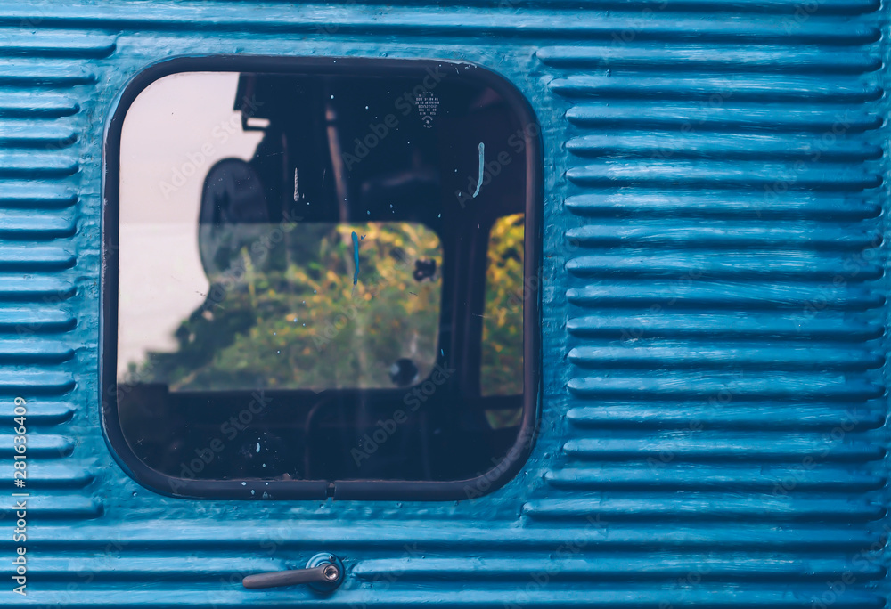 Glass window of old vintage train with blue container abstract travel background