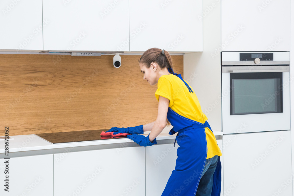 professional cleaning service. Two women in working uniform, in aprons, divide the cleaning of the kitchen of a private house, cottage. washing the refrigerator, tap, sink. Wash floor.