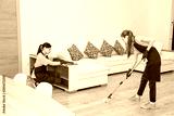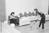 professional cleaning service. Two women in working uniform, in aprons, divide the cleaning of the kitchen of a private house, cottage. Washing floor