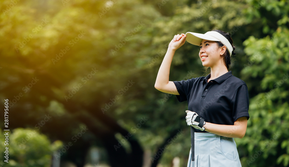 Asian female golfer look happy with her golf game.Professional female golfer holding golf club on field and looking away.